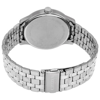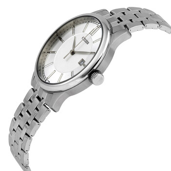 Stainless steel case with a stainless steel bracelet. Fixed stainless steel bezel. Silver dial with luminous silver-tone hands and index hour markers. Minute markers around the outer rim. Dial Type: Analog. Luminescent hands and markers. Date display at the 3 o'clock position. Quartz movement. Scratch resistant mineral crystal. Pull / push crown. Solid case back. Round case shape. Case size: 42 mm. Case thickness: 9 mm. Band width: 18 mm. Deployment clasp with a push button release. Water resistant at 50 meters / 165 feet. Functions: date, hour, minute, second. Sport watch style. Watch label: Japan Movt. Citizen Quartz Silver Dial Stainless Steel Men's Watch BI1050-56A.
