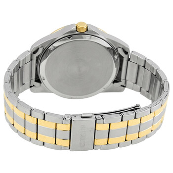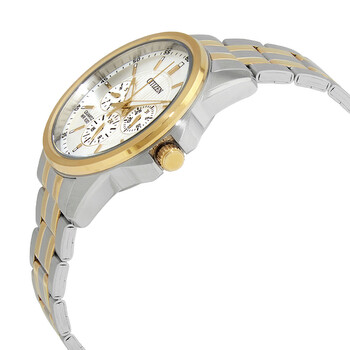 Stainless steel case with a two-tone (silver-tone and gold-tone) stainless steel bracelet. Fixed gold-tone bezel. Silver dial with luminous gold-tone hands and index hour markers. Arabic numeral minute markers (at 5 minute intervals). Minute markers around the outer rim. Dial Type: Analog. Luminescent hands and markers. Three multi-function sub-dials displaying: day of the week, date and 24 hour. Quartz movement. Scratch resistant mineral crystal. Pull / push crown. Solid case back. Round case shape. Case size: 42 mm. Case thickness: 11 mm. Band width: 22 mm. Fold over clasp with a safety release. Water resistant at 100 meters / 330 feet. Functions: date, day, hour, minute, second. Casual watch style. Watch label: Japan Movt. Citizen Quartz Silver Dial Two-tone Men's Watch AG8346-51A.