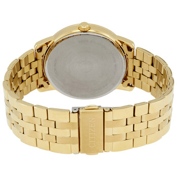 Yellow gold-plated stainless steel case and bracelet. Fixed yellow gold-plated bezel set with crystals. White dial with gold-tone hands and crystal hour markers. Dial Type: Analog. Date display at the 6 o'clock position. Quartz movement. Scratch resistant mineral crystal. Pull / push crown. Solid case back. Round case shape. Case size: 40 mm. Case thickness: 8 mm. Band width: 22 mm. Fold over clasp with a push button release. Water resistant at 50 meters / 165 feet. Functions: date, hour, minute, second. Dress watch style. Watch label: Japan Movt. Citizen Quartz White Crystald Dial Ladies Watch BI5032-56A.