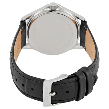 Stainless steel case with a black leather strap. Fixed stainless steel bezel. White dial with luminous black hands and Arabic numeral hour markers. Minute markers around the outer rim. Dial Type: Analog. Luminescent hands and markers. Day of the week and date display at the 3 o'clock position. Citizen caliber G101 quartz movement. Scratch resistant mineral crystal. Pull / push crown. Solid case back. Round case shape. Case size: 37.5 mm. Case thickness: 8 mm. Band width: 20 mm. Tang clasp. Water resistant at 50 meters / 165 feet. Functions: date, day, hour, minute, second. Casual watch style. Citizen Quartz White Dial Black Leather Men's Watch BF5000-01A.