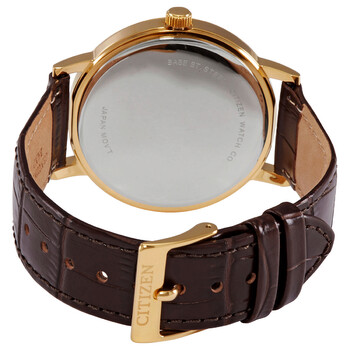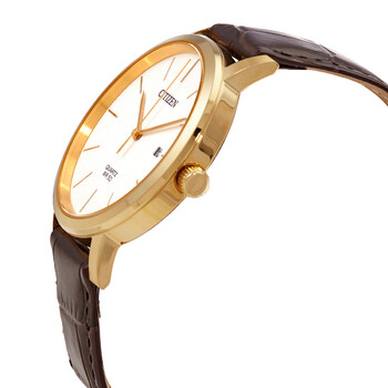 Yellow gold-tone stainless steel case with a brown leather strap. Fixed yellow gold-tone bezel. White dial with yellow gold-tone hands and index hour markers. Dial Type: Analog. Date display at the 3 o'clock position. Citizen caliber G111 quartz movement. Scratch resistant mineral crystal. Pull / push crown. Solid case back. Round case shape. Case size: 40.5 mm. Case thickness: 8 mm. Band width: 20 mm. Tang clasp. Water resistant at 50 meters / 165 feet. Functions: date, hour, minute, second. Casual watch style. Citizen Quartz White Dial Brown Leather Men's Watch BI5072-01A.
