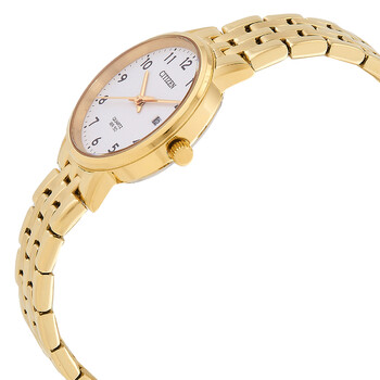 Gold-tone stainless steel case and bracelet. Fixed gold-tone stainless steel bezel. White dial with gold-tone hands and Arabic numeral hour markers. Minute markers around the outer rim. Dial Type: Analog. Date display at the 3 o'clock position. Quartz movement. Scratch resistant mineral crystal. Solid case back. Round case shape, case size: 28 mm, case thickness: 11 mm. Deployment with push button release clasp. Water resistant at 50 meters / 165 feet. Functions: date, hour, minute, second. Dress watch style. Watch label: Japan Movt. Citizen Quartz White Dial Ladies Watch EU6093-56A.