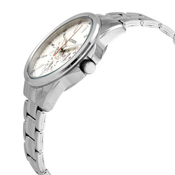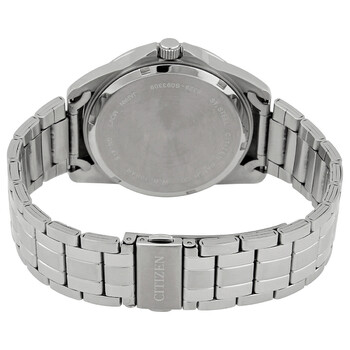 Stainless steel case with a stainless steel bracelet. Fixed stainless steel bezel. White dial with luminous silver-tone hands and index hour markers. Arabic numeral minute markers (at 5 minute intervals). Minute markers around the outer rim. Dial Type: Analog. Luminescent hands and markers. Three multi-function sub-dials displaying: day of the week, date and 24 hour. Quartz movement. Scratch resistant mineral crystal. Pull / push crown. Solid case back. Round case shape. Case size: 42 mm. Case thickness: 11 mm. Band width: 22 mm. Fold over clasp with a safety release. Water resistant at 100 meters / 330 feet. Functions: date, day, hour, minute, second. Casual watch style. Watch label: Japan Movt. Citizen Quartz White Dial Men's Watch AG8340-58A.