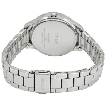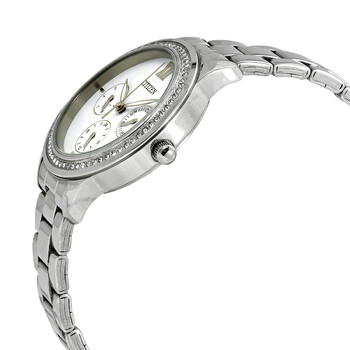 Stainless steel case with a stainless steel bracelet. Fixed stainless steel bezel set with crystals. White dial with luminous silver-tone leaf-style hands. A Roman numeral appears at the 12 o'clock positions.Index markers at the 3, 6 and 9 o'clock positions. Dial Type: Analog. Luminescent hands. Three multi-function sub-dials displaying: date, day of the week, and 24 hours. Quartz movement. Scratch resistant mineral crystal. Pull / push crown. Solid case back. Round case shape. Case size: 36 mm. Case thickness: 9 mm. Band width: 15 mm. Fold over clasp with a push button release Water resistant at 30 meters / 100 feet. Functions: date, day, hour, minute, second. Dress watch style. Watch label: Japan Movt. Citizen Quartz White Dial Stainless Steel Ladies Watch ED8150-53A.