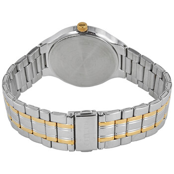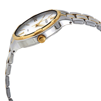 Stainless steel case with a two-tone (silver-tone and yellow gold-tone) stainless steel bracelet. Fixed yellow gold-tone bezel. White dial with yellow gold-tone hands and index hour markers. Roman numerals mark the 3, 6, 9 and 12 o'clock positions. Minute markers around the outer rim. Dial Type: Analog. Date display at the 3 o'clock position. Citizen caliber G111 quartz movement. Scratch resistant mineral crystal. Pull / push crown. Solid case back. Round case shape. Case size: 38 mm. Case thickness: 8.5 mm. Band width: 18 mm. Fold over clasp with a push button release. Water resistant at 50 meters / 165 feet. Functions: date, hour, minute, second. Casual watch style. Watch label: Japan Movt. Citizen Quartz White Dial Stainless Steel Men's Watch BI5024-54A.