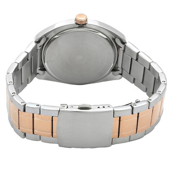 Silver-tone stainless steel case with a two-tone (silver-tone and rose gold ip) stainless steel bracelet. Fixed rose gold IP stainless steel bezel. Wine red dial with rose gold-tone hands and index hour markers. Minute markers around the outer rim. Dial Type: Analog. Date display at the 3 o'clock position. Citizen Caliber G112 quartz movement. Scratch resistant mineral crystal. Pull / push crown. Solid case back. Round case shape, case size: 41 mm, case thickness: 9 mm. Band width: 22 mm. Fold over clasp with a safety release. Water resistant at 50 meters / 165 feet. Functions: date, hour, minute, second. Dress watch style. Watch label: Japan Movt. Citizen Quartz Wine Red Dial Two-Tone Men's Watch BI5104-57X.
