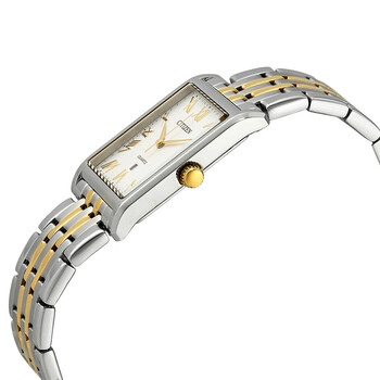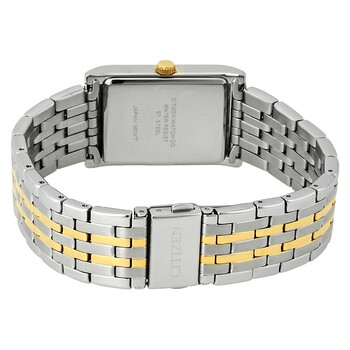 Stainless steel case with a two-tone (silver-tone and yellow gold-tone) stainless steel bracelet. Fixed stainless steel bezel. White dial with yellow gold-tone hands and Roman numeral hour markers. Minute markers around the outer rim. Dial Type: Analog. Date display at the 6 o'clock position. Quartz movement. Scratch resistant mineral crystal. Pull / push crown. Solid case back. Rectangle case shape. Case size: 25.5 mm. Case thickness: 6.9 mm. Band width: 20 mm. Fold over clasp with a safety release. Water resistant at 50 meters / 165 feet. Functions: date, hour, minute, second. Casual watch style. Watch label: Japan Movt. Citizen Quatz White Dial Men's Watch BH3004-59A.