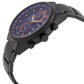 Black stainless steel case and bracelet. Fixed black stainless steel bezel. Blue dial with index hour markers. Minute markers around the outer rim. Dial Type: Analog. Date display at the 3 o'clock position. Three sub-dials displaying: 60 second, 24 hour and dual 1/100th of a second/day of the week. Citizen Caliber H800 eco-drive movement. Scratch resistant sapphire crystal. Solid case back. Round case shape, case size: 43 mm, case thickness: 10.2 mm. Band width: 22 mm. Fold over clasp with a safety release. Water resistant at 100 meters / 330 feet. Functions: perpetual calendar, chronograph, world time, alarm, date, day, second time zone, hour, minute, second, solar-powered. Radio-controlled Series. Sport watch style. Watch label: Japan Movt. Citizen Radio-Controlled World Time Chronograph Blue Dial Men's Watch AT8265-57L.