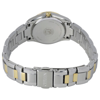 Stainless steel case with a two-tone stainless steel bracelet. Fixed gold-tone bezel set with 20 diamonds. Mother of pearl dial with gold-tone hands and diamond hour markers. Dial Type: Analog. Luminescent hands and markers. Date display appears at the 3 o'clock position. Eco-drive movement. Scratch resistant sapphire crystal. Pull / push crown. Solid case back. Case diameter: 26 mm. Case thickness: 8 mm. Round case shape. Band width: 14 mm. Deployment clasp with a push button release. Water resistant at 100 meters / 330 feet. Functions: date, hour, minute, second. Dress watch style. Watch label: Made in Japan. Citizen Regent Eco-Drive Diamond Mother of Pearl Dial Two-Tone Stainless Steel Ladies Watch EW1824-57D.