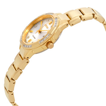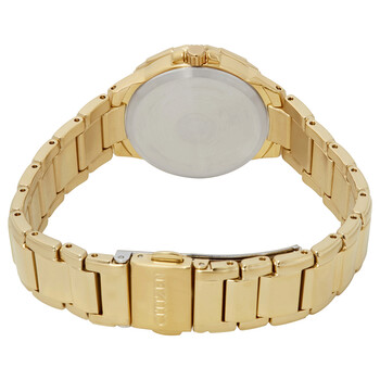 Yellow gold-tone stainless steel case and bracelet. Fixed yellow gold-tone bezel set with diamonds. Silver dial with yellow gold-tone hands and alternating diamond and index hour markers. Minute markers around the outer rim. Dial Type: Analog. Luminescent markers. Date display at the 3 o'clock position. Citizen caliber Eco-Drive E013 quartz movement. Scratch resistant mineral crystal. Pull / push crown. Solid case back. Round case shape. Case size: 30 mm. Case thickness: 8 mm. Band width: 15 mm. Band length: 7 inches. Fold over clasp with a push button release. Water resistant at 50 meters / 165 feet. Functions: date, hour, minute, second. Dress watch style. Watch label: Japan Movt. Citizen Riva Diamond Silver Dial Ladies Watch EW2462-51A.