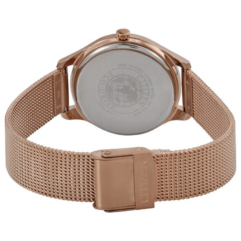 Rose gold-tone stainless steel case with a rose gold-tone stainless steel mesh bracelet. Fixed rose gold-tone bezel. Rose dial with rose gold-tone hands and index hour markers. Minute markers around the outer rim. Dial Type: Analog. Citizen caliber Eco-Drive E031 eco-drive movement. Scratch resistant mineral crystal. Pull / push crown. Solid case back. Round case shape. Case size: 32 mm. Case thickness: 7.3 mm. Band width: 14 mm. Fold over slip through clasp. Water resistant at 50 meters / 165 feet. Functions: hour, minute, second. Casual watch style. Watch label: Japan Movt. Citizen Rose Dial Rose Gold-tone Ladies Watch EM0503-83X.