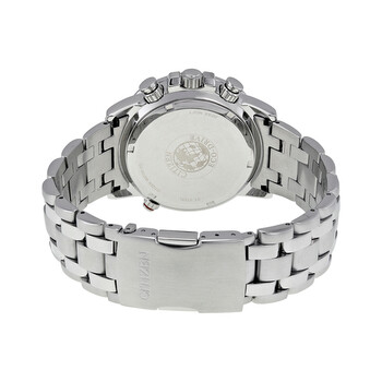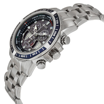 Silver-tone stainless steel case with a silver-tone stainless steel bracelet. Bi-directional rotating bezel. Dark blue dial with index hour markers. Dial Type: Analog-digital. Three - 24-hour, 60 minute, mode indicator. Eco-drive movement. Scratch resistant mineral crystal. Solid case back. Case diameter: 43 mm. Round case shape. Fold over with hidden double push button clasp. Water resistant at 100 meters / 330 feet. Functions: chronograph, date, hour, minute, second, alarm. Sport watch style. Watch label: Japan Movt. Citizen Sailhawk Dark Blue Dial Men's Watch JR4051-54L.