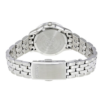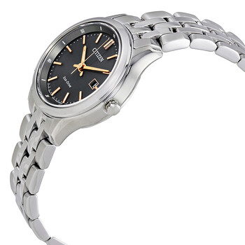 Stainless steel case with a silver-tone stainless steel bracelet. Fixed stainless steel bezel. Grey dial with luminous rose gold-tone hands and index hour markers. Minute markers around the outer rim. Dial Type: Analog. Luminescent hands and markers. Date display at the 3 o'clock position. Citizen caliber Eco-Drive E011 eco-drive movement. Scratch resistant sapphire crystal. Pull / push crown. Solid case back. Round case shape. Case size: 28 mm. Case thickness: 9 mm. Band width: 15 mm. Fold over clasp with a safety release. Water resistant at 100 meters / 330 feet. Functions: date, hour, minute, second. Casual watch style. Watch label: Japan Movt. Citizen Sapphire Grey Dial Ladies Watch EW2400-58H.