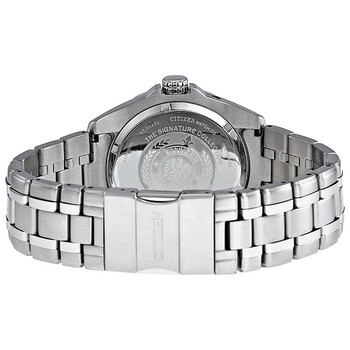 Stainless steel case with a stainless steel bracelet. Uni-directional rotating bezel. Black dial with silver-tone hands and stick hour markers. Minute markers around the outer rim. Dial Type: Analog. Luminescent hands and markers. Date display appears at the 3 o'clock position. Eco-drive movement. Scratch resistant sapphire crystal. Screw down crown. Solid case back. Case diameter: 43 mm. Case thickness: 12.5 mm. Round case shape. Band width: 24 mm. Fold over with safety clasp. Water resistant at 300 meters / 1000 feet. Functions: date, hour, minute, second. Casual watch style. Citizen Signature Eco-Drive Black Dial Stainless Steel Men's Watch BL1250-55E.