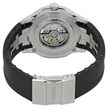 Stainless steel case with a black polyurethane strap with stainless steel accents. Uni-directional rotating stainless steel bezel with a black ion-plated ring. Black (skeleton window) dial with luminous silver-tone hands and index hour markers. Minute markers around the outer rim. Dial Type: Analog. Luminescent hands and markers. Citizen caliber Eco-Drive 9040 automatic movement with a 42-hour power reserve. Scratch resistant sapphire crystal. Pull / push crown. Transparent case back. Round case shape. Case size: 44 mm. Case thickness: 11 mm. Band width: 22 mm. Deployment clasp with a push button release. Water resistant at 100 meters / 330 feet. Functions: hour, minute, second. Casual watch style. Watch label: Japan Movt. Citizen Signature Octavia Automatic Black Dial Men's Watch NB4018-04E.