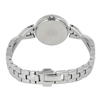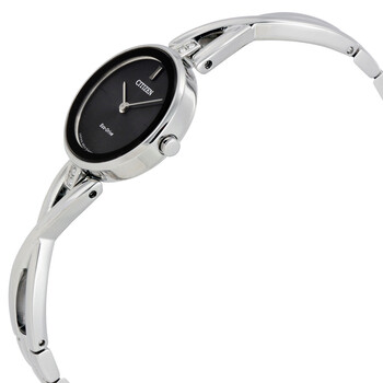 Stainless steel case with a stainless steel cross-over bracelet. Fixed stainless steel bezel. Black dial with silver-tone hands. Index markers at the 3, 6, 9 and 12 o'clock o'clock positions. Dial Type: Analog. Citizen Caliber Eco-Drive B023 quartz movement. Scratch resistant mineral crystal. Pull / push crown. Solid case back. Case size: 23 mm. Case thickness: 6.1 mm. Round case shape. Band width: 10 mm. Jewelry clasp. Water resistant at 30 meters / 100 feet. Functions: hour, minute. Casual watch style. Watch label: Japan Movt. Citizen Silhouette Black Dial Ladies Watch EX1420-50E.