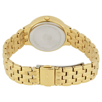 Yellow gold-tone stainless steel case and bracelet. Fixed yellow gold-tone bezel set with Swarovski crystals. Light champagne dial with luminous yellow gold-tone hands and alternating Arabic numeral and dot hour markers. Dial Type: Analog. Luminescent hands. Eco-Drive J730 quartz movement. Scratch resistant spherical crystal crystal. Pull / push crown. Solid case back. Round case shape. Case size: 31 mm. Case thickness: 12 mm. Band width: 15 mm. Band length: 7 inches. Fold over clasp with a push button release. Water resistant at 50 meters / 165 feet. Functions: hour, minute, second. Dress watch style. Citizen Silhouette Crystal Eco-Drive Champagne Dial Ladies Watch FE2082-51P.