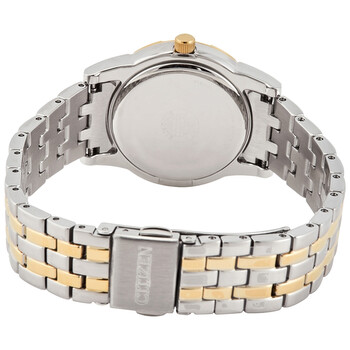 Stainless steel case with a two-tone (silver-tone and yellow gold-tone) stainless steel bracelet. Fixed yellow gold-tone bezel set with Swarovski crystals. Mother of pearl dial with yellow gold-tone hands and Swarovski crystal hour markers. Dial Type: Analog. Citizen caliber Eco-Drive E031 eco-drive movement. Scratch resistant mineral crystal. Pull / push crown. Solid case back. Round case shape. Case size: 31 mm. Case thickness: 8.7 mm. Bracelet width: 16 mm. Fold over clasp. Water resistant at 50 meters / 165 feet. Functions: hour, minute, second, solar-powered. Dive watch style. Watch label: Japan Movt. Citizen Silhouette Crystal Eco-Drive Ladies Watch EM0774-51D.