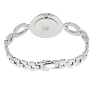 Stainless steel case with a stainless steel bracelet. Fixed stainless steel crystal-set bezel. Mother of pearl dial with silver-tone hands and dot hour markers. Dial Type: Analog. Citizen caliber Eco-Drive B023 quartz movement. Scratch resistant mineral crystal. Pull / push crown. Solid case back. Case size: 24 mm. Case thickness: 7.3 mm. Round case shape. Band width: 11 mm. Jewelry clasp with a push button release. Water resistant at 30 meters / 100 feet. Functions: hour, minute. Casual watch style. Citizen Silhouette Crystal Ladies Watch EX1440-61D.