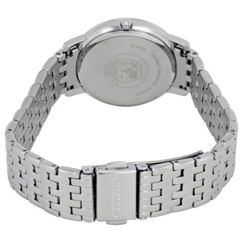 Stainless steel case with a stainless steel bracelet. Fixed stainless steel bezel set with Swarovski crystals. Navy blue dial with silver-tone hands and index hour markers. A Roman numeral appears at the 12 o'clock position. Minute markers around the outer rim. Dial Type: Analog. Citizen caliber Eco-Drive B023 eco-drive movement. Scratch resistant sapphire crystal. Pull / push crown. Solid case back. Case size: 29 mm. Case thickness: 7 mm. Round case shape. Band width: 14 mm. Band length: 7 inches. Fold over with push button release clasp. Water resistant at 50 meters / 165 feet. Functions: hour, minute. Dress watch style. Watch label: Japan Movt. Citizen Silhouette Crystal Navy Blue Dial Ladies Watch EX1480-58L.