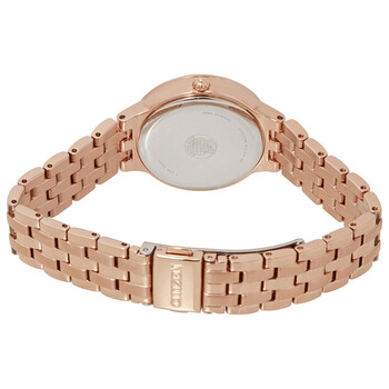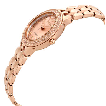 Pink gold-tone stainless steel case and bracelet. Fixed pink gold-tone bezel set with Swarovski crystals. Pink gold dial with pink gold-tone hands and alternating Arabic numeral and dot hour markers. Dial Type: Analog. Luminescent hands. Eco-Drive J730 quartz movement. Scratch resistant spherical crystal crystal. Pull / push crown. Solid case back. Round case shape. Case size: 31 mm. Case thickness: 12 mm. Band width: 15 mm. Band length: 7 inches. Fold over clasp with a push button release. Water resistant at 50 meters / 165 feet. Functions: hour, minute, second. Dress watch style. Citizen Silhouette Crystal Pink Gold Dial Ladies Watch FE2083-58Q.