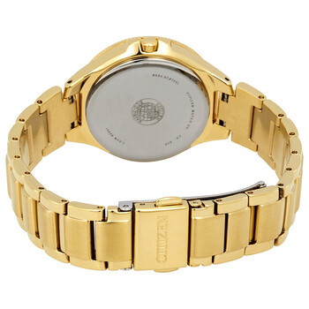 Gold-tone stainless steel case and bracelet. Fixed gold-tone bezel set with Swarovski crystals. Silver dial with gold-tone hands and alternating index and Swarovski crystal hour markers. Dial Type: Analog. Date display at the 3 o'clock position. J710 eco-drive movement. Scratch resistant mineral crystal. Pull / push crown. Solid case back. Round case shape. Case size: 31 mm. Case thickness: 9 mm. Fold over clasp with a safety release. Water resistant at 50 meters / 165 feet. Functions: date, hour, minute, second. Silhouette Crystal Series. Dress watch style. Citizen Silhouette Crystal Silver Dial Gold-tone Men's Watch FE1192-58A.