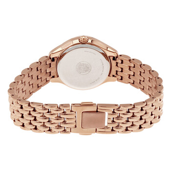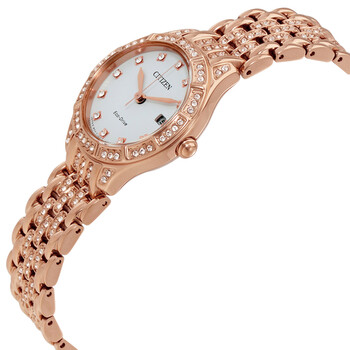 Rose gold-tone stainless steel case and bracelet. Fixed rose gold-tone bezel set with Swarovski crystals. Silver dial with rose gold-tone hands and index hour markers. Dial Type: Analog. Date display at the 3 o'clock position. Eco-Drive E013 eco-drive movement. Scratch resistant mineral crystal. Pull / push crown. Solid case back. Case size: 28 mm. Case thickness: 8.1 mm. Round case shape. Band width: 14 mm. Jewelry clasp. Water resistant at 30 meters / 100 feet. Functions: date, hour, minute, second. Casual watch style. Watch label: Japan Movt. Citizen Silhouette Crystal Silver Dial Ladies Crystal Watch EW2323-57A.