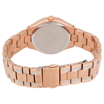 Rose gold-tone stainless steel case with a rose gold-tone stainless steel bracelet set with crystals. Fixed rose gold-tone bezel set with crystals. Silver dial with luminous rose gold-tone hands and index hour markers. Roman numeral markers at the 6 and 12 o'clock positions. Minute markers around the outer rim. Dial Type: Analog. Luminescent hands. Date display at the 3 o'clock position. Citizen caliber Eco-Drive J710 eco-drive movement. Scratch resistant mineral crystal. Pull / push crown. Solid case back. Round case shape. Case size: 30 mm. Fold over clasp with a safety release. Water resistant at 50 meters / 165 feet. Functions: date, hour, minute, second, solar-powered. Silhouette Crystal Series. Dress watch style. Watch label: Japan Movt. Citizen Silhouette Crystal Silver Dial Ladies Watch FE1233-52A.