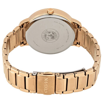 Rose gold-tone stainless steel case and bracelet. Fixed rose gold-tone bezel set with Swarovsk crystals. Silver dial with rose gold-tone hands and Swarovsk crystal-tipped index hour markers. Dial Type: Analog. Citizen caliber J830 eco-drive movement. Scratch resistant mineral crystal. Solid case back. Round case shape. Case size: 36 mm. Case thickness: 9.6 mm. Band width: 16 mm. Fold over clasp with a push button release. Water resistant at 50 meters / 165 feet. Functions: hour, minute, second, solar-powered. Dress watch style. Watch label: Japan Movt. Citizen Silhouette Crystal Silver Dial Ladies Watch FE7043-55A.
