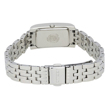Stainless steel case with a stainless steel bracelet. Fixed stainless steel bezel set with Swarovski crystals. White dial with blue hands and alternating index and Roman numeral hour markers. Dial Type: Analog. Citizen Caliber Eco-Drive B023 eco-drive movement. Scratch resistant spherical crystal crystal. Pull / push crown. Solid case back. Case size: 25 mm x 17 mm. Case thickness: 7 mm. Rectangle case shape. Band width: 18 mm. Band length: 7 inches. Fold over clasp with a push button release. Water resistant at 30 meters / 100 feet. Functions: hour, minute. Dress watch style. Watch label: Japan Movt. Citizen Silhouette Crystal White Dial Ladies Watch EX1470-51A.