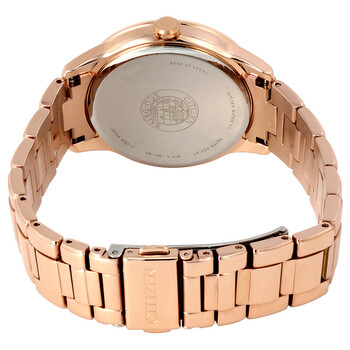 Pink gold-tone stainless steel case and bracelet. Fixed pink gold-tone bezel set with Swarovski crystals. White dial with luminous pink gold-tone hands and index hour markers. An Arabic numeral appears at the 12 o'clock position. Dial Type: Analog. Luminescent hands. Three multi-function sub-dials displaying: 24 hour, date and day of the week. Eco-drive movement. Scratch resistant mineral crystal. Solid case back. Case diameter: 37 mm. Round case shape. Fold over clasp with a safety release. Water resistant at 100 meters / 330 feet. Functions: date, day, 24 hour, hour, minute, second. Dress watch style. Watch label: Japan Movt. Item Variations: FD2013 50A, FD2013.50A, FD201350A. Citizen Silhouette Crystal White Dial Rose Gold-tone Ladies Watch FD2013-50A.