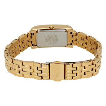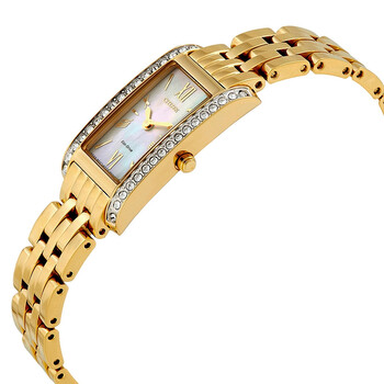 Yellow gold-tone stainless steel case and bracelet. Fixed yellow gold-tone bezel set with Swarovski crystals. White mother of pearl dial with yellow gold-tone hands and index hour markers. Roman numerals mark the 6 and 12 o'clock positions. Dial Type: Analog. Citizen Caliber Eco-Drive B023 eco-drive movement. Scratch resistant mineral crystal. Pull / push crown. Solid case back. Rectangle case shape. Case dimensions: 25 mm x17 mm. Band width: 17 mm. Fold over clasp with a push button release. Water resistant at 30 meters / 100 feet. Functions: hour, minute. Dress watch style. Watch label: Japan Movt. Citizen Silhouette Crystal White Mother of Pearl Dial Ladies Watch EX1472-56D.