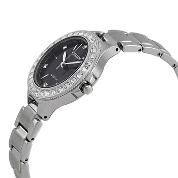 Stainless steel case with a stainless steel bracelet. Fixed stainless steel bezel set with Swarovski crystals. Black dial with silver-tone hands and alternating Swarovski crystal and index hour markers. Dial Type: Analog. Date display at the 3 o'clock position. Citizen caliber J710 eco-drive movement. Scratch resistant mineral crystal. Pull / push crown. Solid case back. Round case shape. Case size: 31 mm. Case thickness: 9.1 mm. Band width: 14 mm. Fold over clasp. Water resistant at 50 meters / 165 feet. Functions: date, hour, minute, second. Dress watch style. Watch label: Japan Movt. Citizen Silhouette Eco-Drive Black Crystal Dial Ladies Watch FE1190-53E.