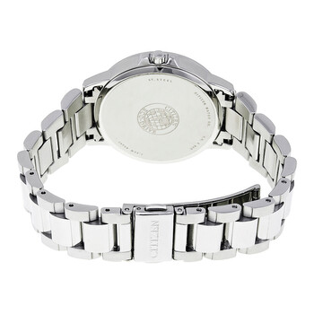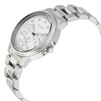 Stainless steel case with a stainless steel bracelet. Fixed stainless steel bezel. Silver crystal-set dial with luminous silver-tone hands and Swarovski crystal hour markers. Dial Type: Analog. Luminescent hands. Date display at the 3 o'clock position. Three multi-function sub-dials displaying: date, day of the week and 24 hours. Citizen caliber Eco-Drive 8729 eco-drive movement. Scratch resistant mineral crystal. Pull / push crown. Solid case back. Round case shape. Case size: 36 mm. Case thickness: 11 mm. Band width: 20 mm. Fold over clasp with a push button release. Water resistant at 50 meters / 165 feet. Functions: date, day, GMT, second time zone, hour, minute, second. Additional Info: in general, suitable for short periods of recreational swimming, but not diving or snorkeling. Casual watch style. Watch label: Japan Movt. Citizen Silhouette Eco-Drive Multi-Function Silver Dial Ladies Watch FD2040-57A.