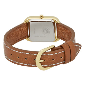 Yellow gold-tone stainless steel case with a brown leather strap. Fixed yellow gold-tone bezel. White dial with yellow gold-tone hands and index hour markers. Dial Type: Analog. Citizen caliber Eco-Drive E031 eco-drive movement. Scratch resistant spherical crystal crystal. Pull / push crown. Solid case back. Rectangle case shape. Case dimensions: 32.2 mm x 23 mm. Case thickness: 8 mm. Band width: 18 mm. Band length: 8 inches. Tang clasp. Water resistant at 30 meters / 100 feet. Functions: hour, minute, second. Dress watch style. Watch label: Japan Movt. Citizen Silhouette Eco-Drive White Dial Brown Leather Ladies Watch EM0492-02A.