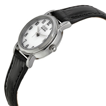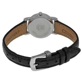 Stainless steel case with a black (pig-skin) leather strap. Fixed stainless steel bezel. White dial with silver-tone hands and Arabic numeral hour markers. Date display at the 3 o'clock position. Japanese quartz movement. Scratch resistant mineral crystal. Stainless steel case back. Case diameter: 23 mm. Case thickness: 7.5 mm. Tang clasp. Water resistant at 30 meters / 100 feet. Functions: date, calendar, hour. Citizen Silhouette Ladies Eco-Drive Watch EW1270-06A.