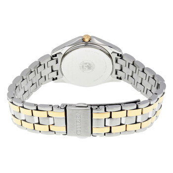 Two-tone stainless steel case with a two-tone stainless steel bracelet. Fixed- crystal set bezel. Champagne dial with rose gold-tone hands and index hour markers. Dial Type: Analog. Date display at the 3 o'clock position. Eco-Drive E011 movement. Scratch resistant mineral crystal. Pull / push crown. Solid case back. Case size: 28 mm. Round case shape. Water resistant at 30 meters / 100 feet. Functions: date, hour, minute, second. Casual watch style. Citizen Silhouette Ladies Watch EW2354-53P.