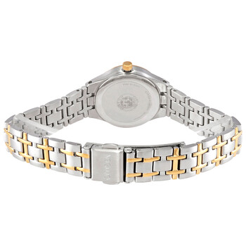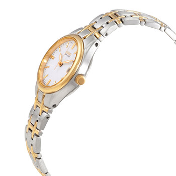 Stainless steel case with a two-tone (silver-tone and gold-tone) stainless steel bracelet. Fixed gold-tone bezel. White dial with luminous gold-tone hands and index hour markers. Minute markers around the outer rim. Dial Type: Analog. Luminescent hands and dial markers. Date display at the 3 o'clock position. Eco-drive movement. Scratch resistant mineral crystal. Pull / push crown. Solid case back. Round case shape. Case size: 25 mm. Case thickness: 7.5 mm. Band width: 13 mm. Fold over clasp with a double push button safety release. Water resistant at 30 meters / 100 feet. Functions: hours, minutes, seconds, date. Additional Info: 180 day power reserve. Silhouette Series. Casual watch style. Watch label: Made in Japan. Item Variations: EW1264 50A, EW1264.50A, EW126450A. Citizen Silhouette White Dial Ladies Watch EW1264-50A.