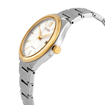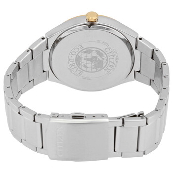 Stainless steel case with a stainless steel bracelet. Fixed gold-tone bezel. Silver dial with luminous gold-tone hands and index hour markers. Minute markers around the outer rim. Dial Type: Analog. Luminescent hands. Date display at the 3 o'clock position. Citizen caliber Eco-Drive J810 eco-drive movement. Scratch resistant mineral crystal. Pull / push crown. Solid case back. Round case shape. Case size: 41 mm. Case thickness: 10 mm. Band width: 22 mm. Fold over clasp with a push button release. Water resistant at 50 meters / 165 feet. Functions: date, hour, minute, second, solar-powered. Eco-drive Series. Casual watch style. Watch label: Japan Movt. Citizen Silver Dial Eco-Drive Stainless Steel Men's Watch AW1374-51B.