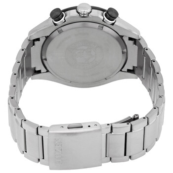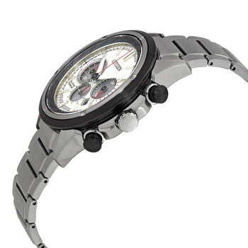Grey titanium case with a grey titanium bracelet. Fixed grey titanium bezel with a black ring. Silver dial with luminous silver-tone hands and index hour markers. Minute markers around the outer rim. Dial Type: Analog. Luminescent hands. Date display between the 4 and 5 o'clock positions. Chronograph - three sub-dials displaying: 60 second, 60 minute and 24 hours. Citizen caliber Eco-Drive B620 eco-drive movement. Scratch resistant sapphire crystal. Solid case back. Round case shape. Case size: 46 mm. Case thickness: 13 mm. Band width: 24 mm. Fold over clasp. Water resistant at 100 meters / 330 feet. Functions: chronograph, date, hour, minute, second, solar-powered. Sport watch style. Watch label: Japan Movt. Citizen Silver Dial Eco-Drive Super Titanium Chronograph Watch CA4241-55A.