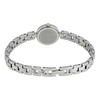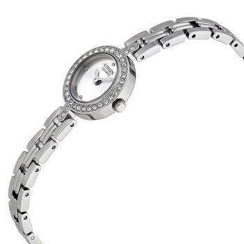 Stainless steel case with a stainless steel bracelet. Fixed stainless steel bezel set with Swarovski crystals. Silver dial with black hands. Dot markers at the 3, 6, 9 and 121 o'clock positions. Dial Type: Analog. Quartz movement. Scratch resistant mineral crystal. Pull / push crown. Solid case back. Case size: 19 mm. Round case shape. Band width: 7 mm. Jewelry clasp. Water resistant at 30 meters / 100 feet. Functions: hour, minute. Casual watch style. Citizen Silver Dial Ladies Watch EZ6340-65A.