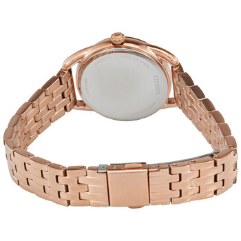 Rose gold-tone stainless steel case and bracelet. Fixed rose gold-tone bezel. Silver dial with luminous rose gold-tone hands and alternating Arabic numeral and index hour markers. Dial Type: Analog. Luminescent hands. Citizen caliber J810 eco-drive movement. Scratch resistant mineral crystal. Pull / push crown. Solid case back. Round case shape. Case size: 30 mm. Case thickness: 8.4 mm. Band width: 14 mm. Fold over clasp with a push button release. Water resistant at 30 meters / 100 feet. Functions: hour, minute, second. Casual watch style. Citizen Silver Dial Ladies Watch FE1213-50A.