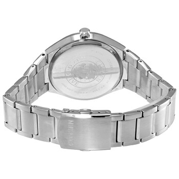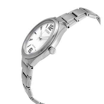 Stainless steel case with a stainless steel bracelet. Fixed stainless steel bezel. Silver dial with luminous silver-tone hands and index hour markers. Arabic numerals appear at the 6 and 12 o'clock positions. Minute markers around the outer rim. Dial Type: Analog. Luminescent hands and markers. Date display at the 3 o'clock position. Citizen caliber J180 eco-drive movement. Scratch resistant mineral crystal. Pull / push crown. Solid case back. Round case shape. Case size: 41 mm. Case thickness: 11 mm. Band width: 16 mm / 21 mm. Fold over clasp with a push button release. Water resistant at 50 meters / 165 feet. Functions: date, hour, minute, second. Casual watch style. Watch label: Japan Movt. Citizen Silver Dial Stainless Steel Men's Watch AW1370-51B.