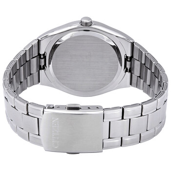 Stainless steel case with a stainless steel bracelet. Fixed stainless steel bezel. Silver dial with silver-tone hands and alternating Roman numeral and index hour markers. Dial Type: Analog. Date display at the 3 o'clock position. Quartz movement. Scratch resistant mineral crystal. Pull / push crown. Solid case back. Round case shape. Case size: 42 mm. Case thickness: 10 mm. Band width: 22 mm. Fold over clasp with a push button release. Water resistant at 30 meters / 100 feet. Functions: date, hour, minute, second. Casual watch style. Watch label: Japan Movt. Citizen Silver Dial Stainless Steel Men's Watch BI0950-51A.