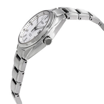 Grey titanium case and bracelet. Fixed grey titanium bezel. Silver dial with luminous silver-tone hands and index hour markers. Arabic numeral minute markers (at 5 minute intervals). Minute markers around the outer rim. Dial Type: Analog. Luminescent hands. Date display at the 3 o'clock position. Citizen caliber E011 eco-drive movement. Scratch resistant sapphire crystal. Pull / push crown. Solid case back. Round case shape. Case size: 34 mm. Case thickness: 9 mm. Band width: 16 mm. Fold over clasp with a push button release. Water resistant at 100 meters / 330 feet. Functions: date, hour, minute, second. Casual watch style. Watch label: Japan Movt. Citizen Silver Dial Titanium Ladies Watch EW2210-53A.