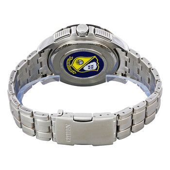 Stainless steel case with a stainless steel bracelet. Uni-directional rotating bezel. Blue dial with silver-tone hands and index hour markers. Dial Type: Analog-digital. Luminescent hands and markers. Four- charge indicator, dual time, 24 hour, functions sub-dials. Quartz movement. Scratch resistant mineral crystal. Screw down crown. Case size: 47 mm. Case thickness: 15 mm. Round case shape. Band width: 23 mm. Fold over clasp with a safety release. Water resistant at 200 meters / 660 feet. Functions: hour, minute, second, chronograph, countdown timer, world timer, alarms, battery charge indicator, perpetual calendar. Sport watch style. Citizen Skyhawk Blue Angels A-T Chronograph Perpetual Men's Watch JY8058-50L.