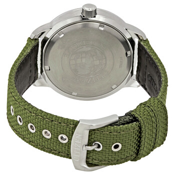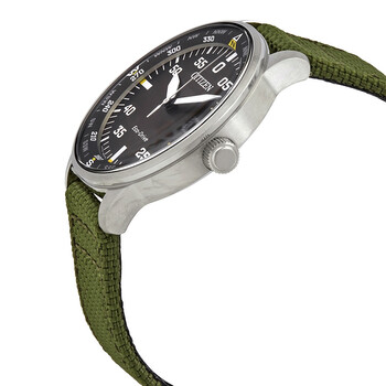 Stainless steel case with a green nylon strap. Fixed stainless steel bezel. Black dial with luminous silver-tone hands and index hour markers. Arabic numeral minute markers (at 5 minute intervals). Minute markers. Compass markings around the outer rim. Dial Type: Analog. Luminescent hands and markers. Date display at the 3 o'clock position. Citizen caliber Eco-Drive E111 eco-drive movement with a 180-day power reserve. Scratch resistant mineral crystal. Pull / push crown. Solid case back. Round case shape. Case size: 42 mm. Case thickness: 11 mm. Band width: 20 mm. Tang clasp. Water resistant at 100 meters / 330 feet. Functions: date, hour, minute, second, compass markings. Casual watch style. Watch label: Japan Movt. Citizen Solar Black Dial Green Nylon Men's Watch BM7390-22X.