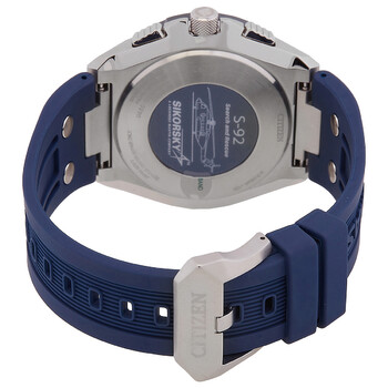 Silver-tone stainless steel case with a blue rubber strap. Fixed blue stainless steel bezel. Blue dial with silver-tone hands and index hour markers. Minute markers around the outer rim. Dial Type: Analog-digital. Perpetual calendar. Chronograph - four sub-dials displaying: charge indicator, dual time, 24 hour, functions. Citizen Caliber Eco-Drive U680 eco-drive movement. Scratch resistant sapphire crystal. Solid case back. Round case shape, case size: 46 mm. Band width: 22 mm. Buckle clasp. Water resistant at 200 meters / 666 feet. Functions: perpetual calendar, chronograph, world time, alarm, GMT, second time zone, hour, minute, second, power reserve indicator, solar-powered. Synchronized to Atomic Time Clock for Superior Accuracy. Atomic Timekeeping Technology with Synchronized Time Adjustment Available in 43 World Cities. 1/100 Second Chronograph Measures up to 24 Hours. Perpetual Calendar. Dual Time (Second Time Zone). 2 Alarms. 99-Minute Countdown Timer. Digital Backlight Display. Universal Coordinated Time (UTC) Display. Power Reserve Indicator. Promaster Sikorsky Series. Sport watch style. Watch label: Japan Movt. Citizen Special Edition Promaster x Sikorsky S-92 Analog-Digital Blue Dial Men's Watch JY8156-00L.