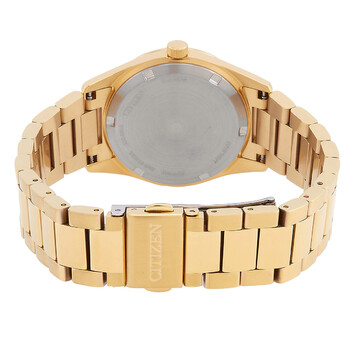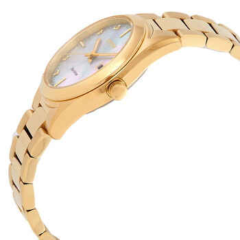 Gold-tone stainless steel case and bracelet. Fixed gold-tone stainless steel bezel. White mother of pearl dial with gold-tone hands and diamond-index hour markers. Minute markers around the outer rim. Dial Type: Analog. Date display at the 3 o'clock position. Citizen Caliber Eco-Drive E013 eco-drive movement. Scratch resistant sapphire crystal. Solid case back. Round case shape, case size: 33 mm. Band width: 18 mm. Fold over clasp with a safety release. Water resistant at 100 meters / 330 feet. Functions: date, hour, minute, second, solar-powered. Sport Luxury Series. Casual watch style. Watch label: Japan Movt. Citizen Sport Luxury Eco-Drive White Mother of Pearl Dial Ladies Watch EW2702-59D.