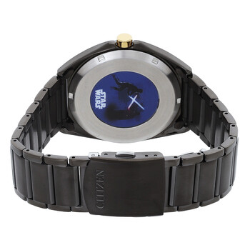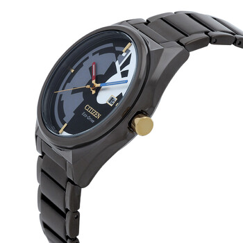 Gray stainless steel case and bracelet. Fixed gray stainless steel bezel. Black dial with blue, red and gold hands and index hour markers. Dial Type: Analog. Luminescent hands. Date display at the 3 o'clock position. Citizen Caliber Eco-Drive J810 eco-drive movement. Scratch resistant mineral crystal. Pull / push crown. Solid case back. Round case shape, case size: 42 mm. Band width: 22 mm, band length: 9.5 inches. Fold over clasp with a safety release. Water resistant at 30 meters / 100 feet. Functions: date, hour, minute, second, solar-powered. Star Wars Classic Series. Sport watch style. Watch label: Japan Movt. Citizen Star Wars Classic Eco-Drive Black Dial Men's Watch AW1578-51W.